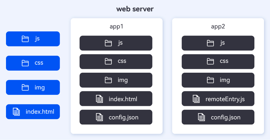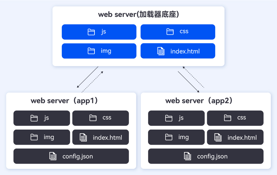 微前端的部署有兩種形式,一種是將所有微應(yīng)用的資源與底座加載器合并成一個(gè)文件夾,進(jìn)行合并部署,只提供一個(gè)Web服務(wù);另一種則是將底座和微應(yīng)用分開(kāi)部署,每個(gè)微應(yīng)用都提供單獨(dú)的Web服務(wù)。