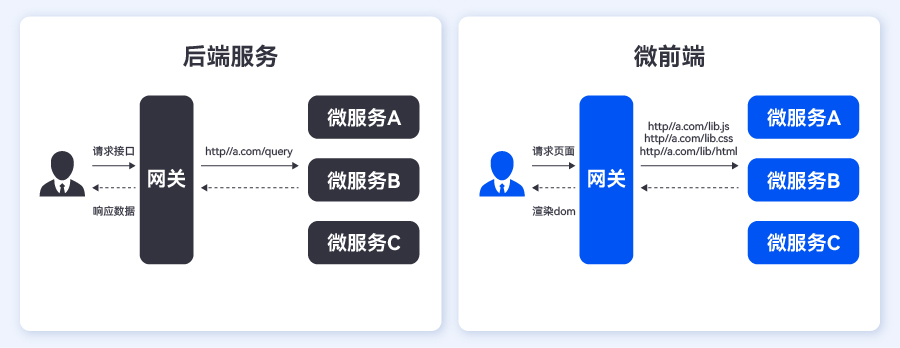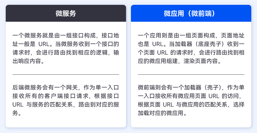 通過(guò)跟微服務(wù)進(jìn)行對(duì)比,我們可以更清晰地理解微前端的概念: