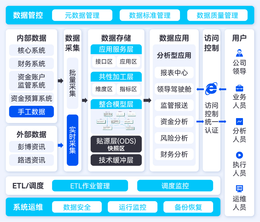 建立離線采集和實時采集兩個通道,基于長亮科技“數(shù)據(jù)交換平臺”、“數(shù)據(jù)補(bǔ)錄平臺”、“外部數(shù)據(jù)管理平臺”實現(xiàn)業(yè)務(wù)結(jié)構(gòu)化數(shù)據(jù)、線下手工臺賬數(shù)據(jù)、集團(tuán)數(shù)據(jù)以及工商、稅務(wù)等外部數(shù)據(jù)采集存儲,逐步將合同、憑證等非結(jié)構(gòu)化數(shù)據(jù)納入數(shù)據(jù)平臺管理,實現(xiàn)數(shù)據(jù)統(tǒng)一采集、統(tǒng)一存儲、統(tǒng)一加工,為打破數(shù)據(jù)孤島,實現(xiàn)數(shù)據(jù)橫向貫通、縱向穿透奠定基礎(chǔ);