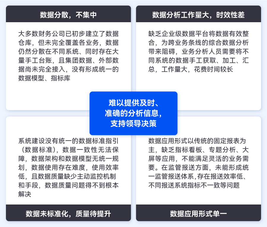 2022年2月國務(wù)院國資委發(fā)布了《關(guān)于中央企業(yè)加快建設(shè)世界一流財務(wù)管理體系的指導(dǎo)意見》,《意見》高度重視“完善智能前瞻的財務(wù)數(shù)智體系”,要求各企業(yè)統(tǒng)一數(shù)據(jù)規(guī)范,避免數(shù)據(jù)孤島、維護(hù)數(shù)據(jù)資產(chǎn)、激活數(shù)據(jù)價值?!皵?shù)據(jù)”已成為財務(wù)數(shù)字化轉(zhuǎn)型的核心資產(chǎn)要素,但相較于商業(yè)銀行,財務(wù)公司受制于起步晚、業(yè)務(wù)性質(zhì)不同等因素,大數(shù)據(jù)能力建設(shè)客觀上仍然存在不小的差距,主要體現(xiàn)在以下方面: