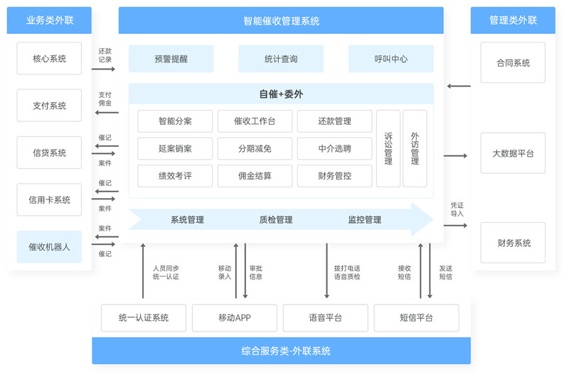 提供統一催收平臺,支持智能洗號、電催、法催、短信、語音、還款及轉派等功能,支持資產公司、律所、催收公司信息共享,支 持催收策略靈活切換,最大限度提高回款效率