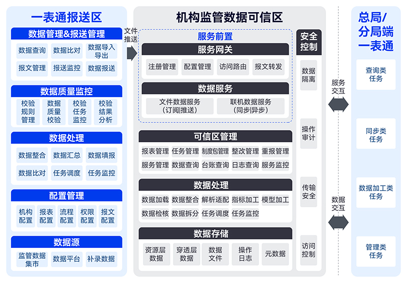 屏蔽底層技術(shù)細(xì)節(jié):通過服務(wù)前置提供標(biāo)準(zhǔn)的服務(wù)接口,打通監(jiān)管端和機(jī)構(gòu)監(jiān)管可信區(qū),從而屏蔽機(jī)構(gòu)端的底層存儲(chǔ)和技術(shù)差異,實(shí)現(xiàn)服務(wù)交互和數(shù)據(jù)交互。