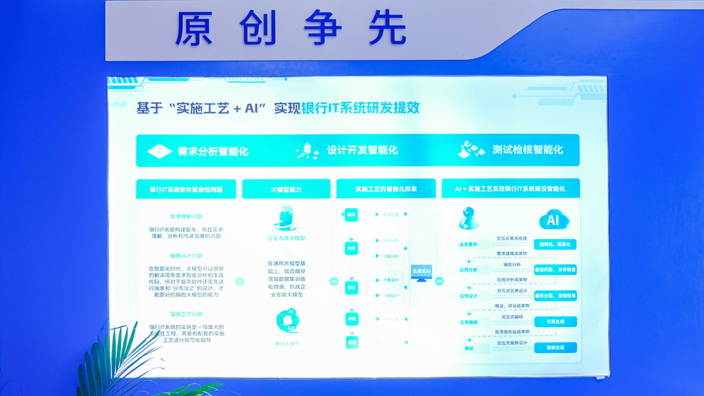 隨著人工智能時代的來臨,長亮科技認為未來軟件工程將向著智能化編程、AI大模型的方向進化,并創新探索出 “實施工藝+AI”這一前沿成果。通過將傳統業務需求轉化為結構化的數字需求資產,實現了從傳統代碼驅動到數字資產驅動的轉變,同時利用生成式AI技術在各個研發階段提供智能輔助,助力銀行重塑研發高效新模式,實現智能化的系統建設。