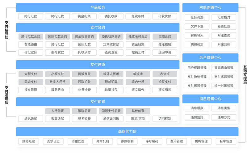 基于智能化支付領域模型進行構建,對建模成果進行功能分析和定義,設計分解并承接建模成果,達到智能編碼目標,使支付領域的交付轉向標準化、結構化、可視化,裝配國內外匯款產品,采用交易和對賬分離,提供新老系統并行的無風險切換方案,具備智能路由、智能入賬、智能記憶、智能分析、智能組包、智能回復、智能回放等特點,為金融機構的支付提供業務研發運營一體化方案。長亮科技支付業務產品包含智能路由、行內轉賬、二代支付、超級網銀、城銀清、農信銀、網聯、銀聯、人民幣跨境支付、數字人民幣、SWIFT、RTGS、FPS、境內外幣支付、支付寶、微信、境外各國家和地區等支付渠道,支持接入傳統核心業務系統、互聯網金融核心業務系統、電商平臺、互聯網收單業務,具備高度的安全運營體系設計,提供統一的支付業務管理、便捷的業務操作、業務流程的實現、支付行為管控、風險控制自動化處理等。