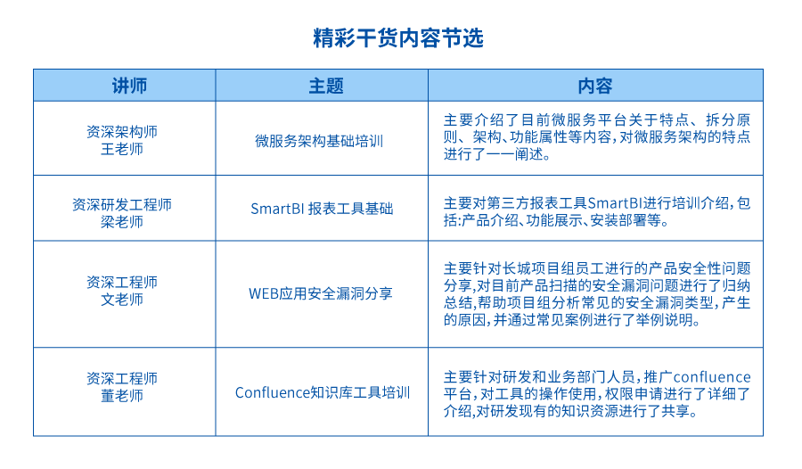 長亮科技認為,員工對企業(yè)文化及戰(zhàn)略目標(biāo)的認知和認同是讓我們成為一家人的基礎(chǔ),因此會在培訓(xùn)中安排較大比例的相關(guān)內(nèi)容,且均由公司高層領(lǐng)導(dǎo)作為直接講師;另外一部分就是根據(jù)崗位需求的因材施教,本期新員工主要崗位涉及java、功能顧問、測試崗等,因此本期培訓(xùn)課程主要覆蓋業(yè)務(wù)相關(guān)的產(chǎn)品及功能介紹、jraf開發(fā)技能及環(huán)境搭建、微服務(wù)等重點專業(yè)技術(shù)培訓(xùn)指導(dǎo)、具體操作實踐等,讓新員工有針對性地成長為專業(yè)人才。