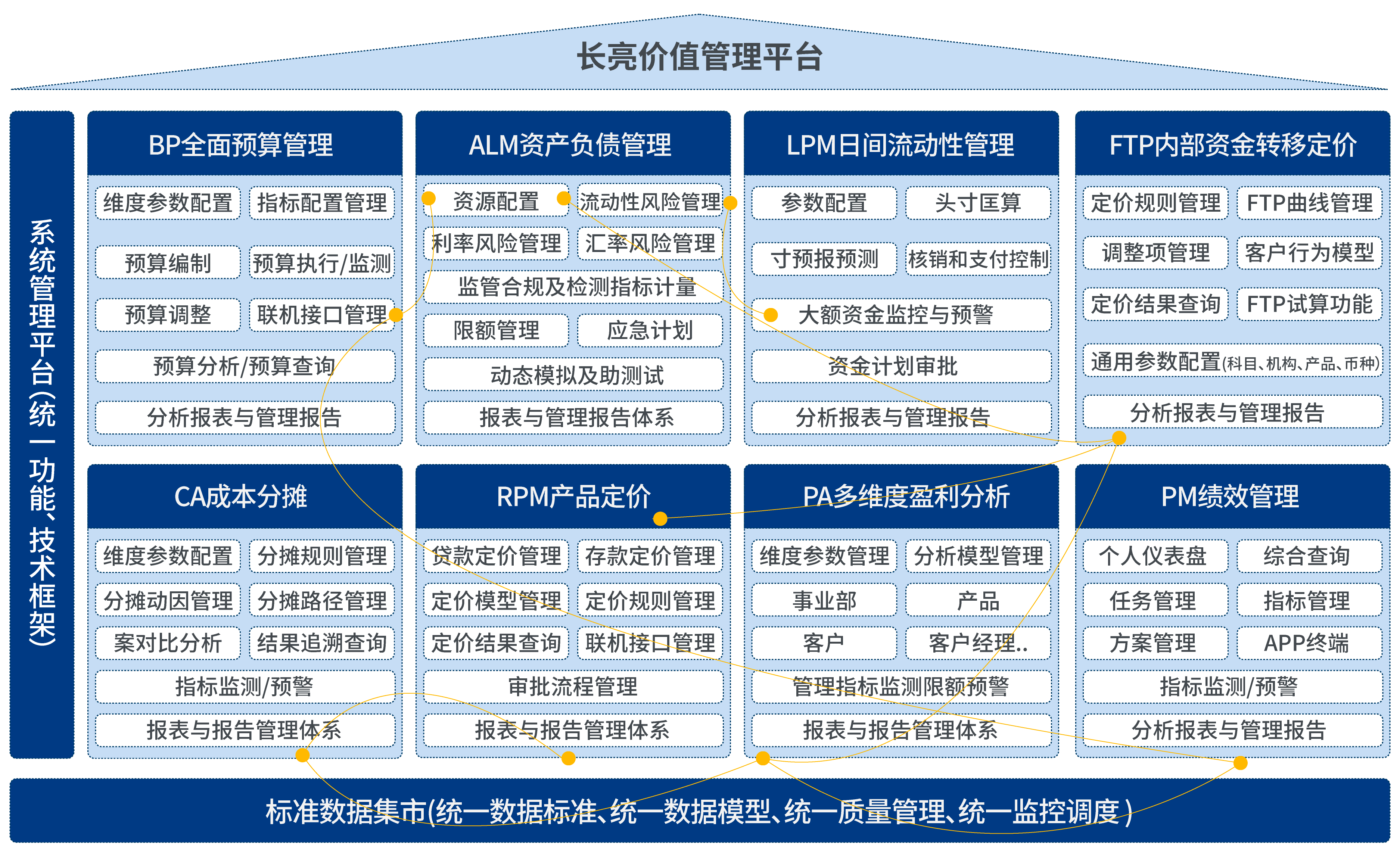 長亮科技全面價值管理解決方案將銀行經營和管理作為一個系統(tǒng)性的整體,通過“標準數(shù)據整合、產品功能聯(lián)通、管理應用協(xié)同、交互體驗優(yōu)化”的一體化產品設計,形成“戰(zhàn)略-組織-流程-績效”的管理協(xié)同,徹底解決銀行面臨的孤島式管理信息系統(tǒng)的建設困局,持續(xù)幫助商業(yè)銀行構建具備銀行業(yè)特色的管理系統(tǒng)。