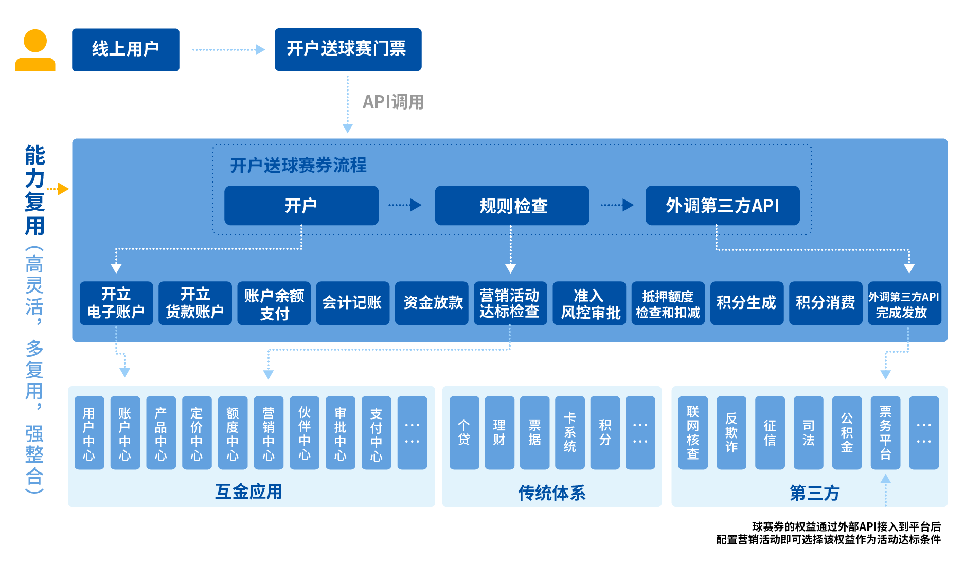以開(kāi)戶送球賽門(mén)票為例:通過(guò)流程編排服務(wù),組合賬戶中心的開(kāi)立電子賬號(hào)的API接口、營(yíng)銷中心的營(yíng)銷活動(dòng)達(dá)標(biāo)檢查接口、票務(wù)平臺(tái)的第三方API接口這三個(gè)服務(wù),共同實(shí)現(xiàn)開(kāi)戶送球賽門(mén)票的場(chǎng)景。