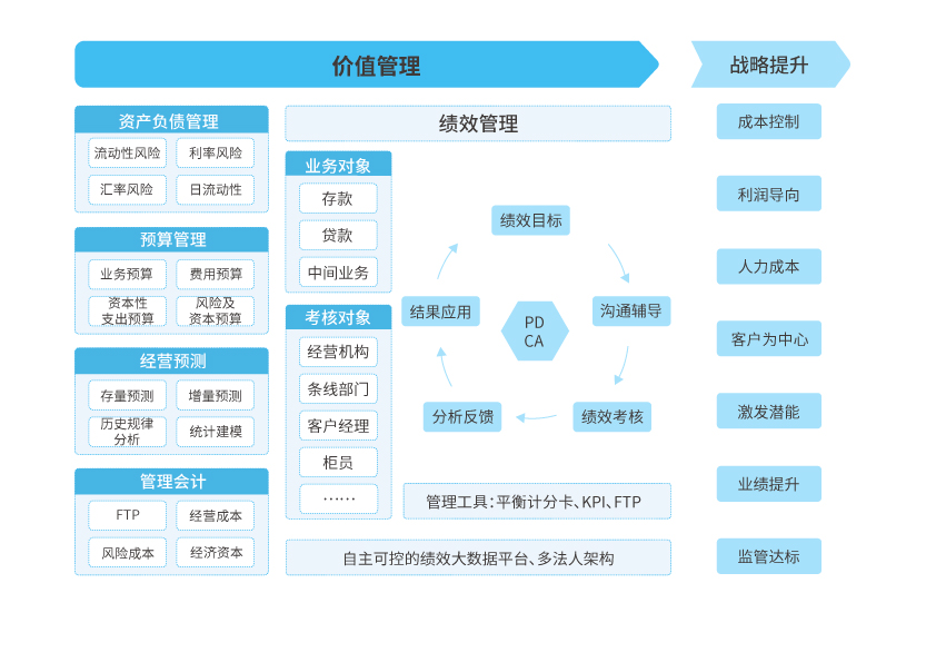 在業(yè)務(wù)架構(gòu)上,績效考核平臺深度契合到銀行整體經(jīng)營與價值管理中,通過深入結(jié)合銀行資產(chǎn)負債、預算等業(yè)務(wù)流程和管理需要,以績效大數(shù)據(jù)平臺為基礎(chǔ),經(jīng)營業(yè)績?yōu)橹攸c,平衡計分卡、KPI等為工具,將銀行的戰(zhàn)略、資源、業(yè)務(wù)和行動有機地結(jié)合起來所構(gòu)成的一個完整的管理體系,幫助銀行實現(xiàn)對機構(gòu)、部門、柜員以及客戶經(jīng)理等全員的精細化的績效管理,實現(xiàn)全行的戰(zhàn)略落地與績效提升。