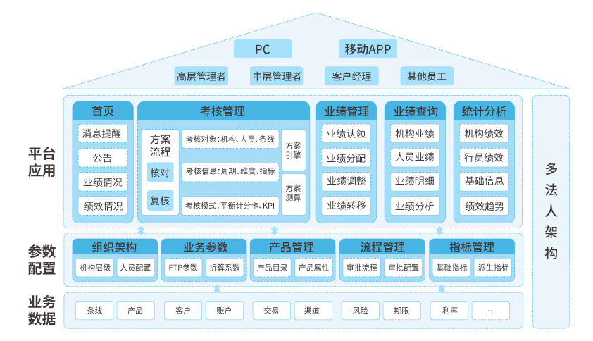 在產(chǎn)品架構(gòu)上,幫助銀行在全行統(tǒng)一考核體系框架下,實現(xiàn)各級法人、分支機構(gòu)、營業(yè)網(wǎng)點和人員的差異化考核,各個層級可以靈活配置考核指標和考核方案,把績效管理思路落地到信息化系統(tǒng)。