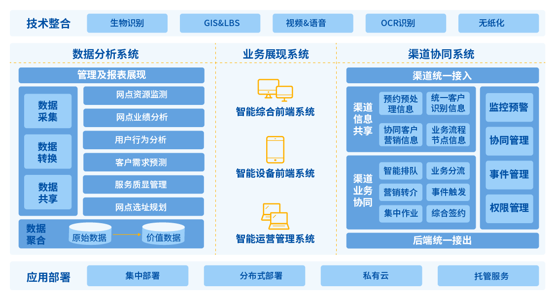 網(wǎng)點(diǎn)智能化服務(wù)流程離不開網(wǎng)點(diǎn)各系統(tǒng)的協(xié)同作業(yè)。而要實(shí)現(xiàn)多系統(tǒng)協(xié)同作業(yè),網(wǎng)點(diǎn)首先需要對(duì)各渠道系統(tǒng)實(shí)現(xiàn)集中接入,完成對(duì)客戶各個(gè)接觸點(diǎn)的統(tǒng)一數(shù)據(jù)采集、監(jiān)測(cè)及分析;并在此基礎(chǔ)上,實(shí)現(xiàn)網(wǎng)點(diǎn)的協(xié)同精準(zhǔn)營(yíng)銷和協(xié)同客戶服務(wù)體驗(yàn)。