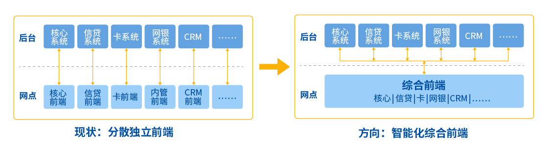 首先,要在橫向上進(jìn)行業(yè)務(wù)功能聚合,將原來(lái)分散在各個(gè)系統(tǒng)的前端功能統(tǒng)一整合到統(tǒng)一的前端平臺(tái)中,并實(shí)現(xiàn)數(shù)據(jù)共享和統(tǒng)一高效的操作體驗(yàn);在縱向上整合多系統(tǒng)、多設(shè)備作業(yè)流程,實(shí)現(xiàn)客戶多渠道統(tǒng)一服務(wù)體驗(yàn)和網(wǎng)點(diǎn)產(chǎn)品協(xié)同營(yíng)銷。