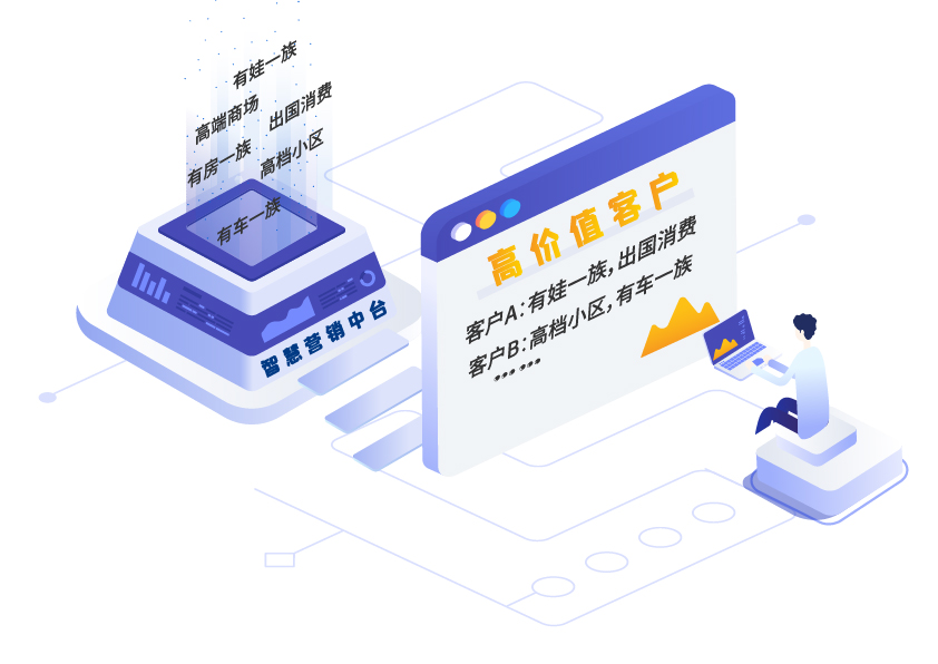 某銀行缺少標簽系統,c端客戶大額資金動賬類信息無法及時傳遞到前臺,銀行客戶經理很難掌握關鍵營銷機會,導致該行資金流失嚴重,80% c端零售客戶最終成為低價值客戶。而通過新一代智慧營銷中臺建立“有房一族”“有車一族”“有娃一族”“出國消費”“高檔小區”“高端商場”等標簽,構建360用戶畫像,可快速發掘和識別出高價值潛力c端客戶。