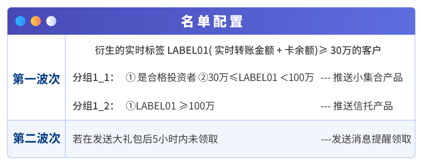 在對實時進賬客戶推送加息券大禮包場景中,系統通過c端客戶標簽多波次篩選出受眾,推送不同的產品,若c端客戶5小時內未領取,系統還會自動推送消息提醒,提升銀行運營效率。