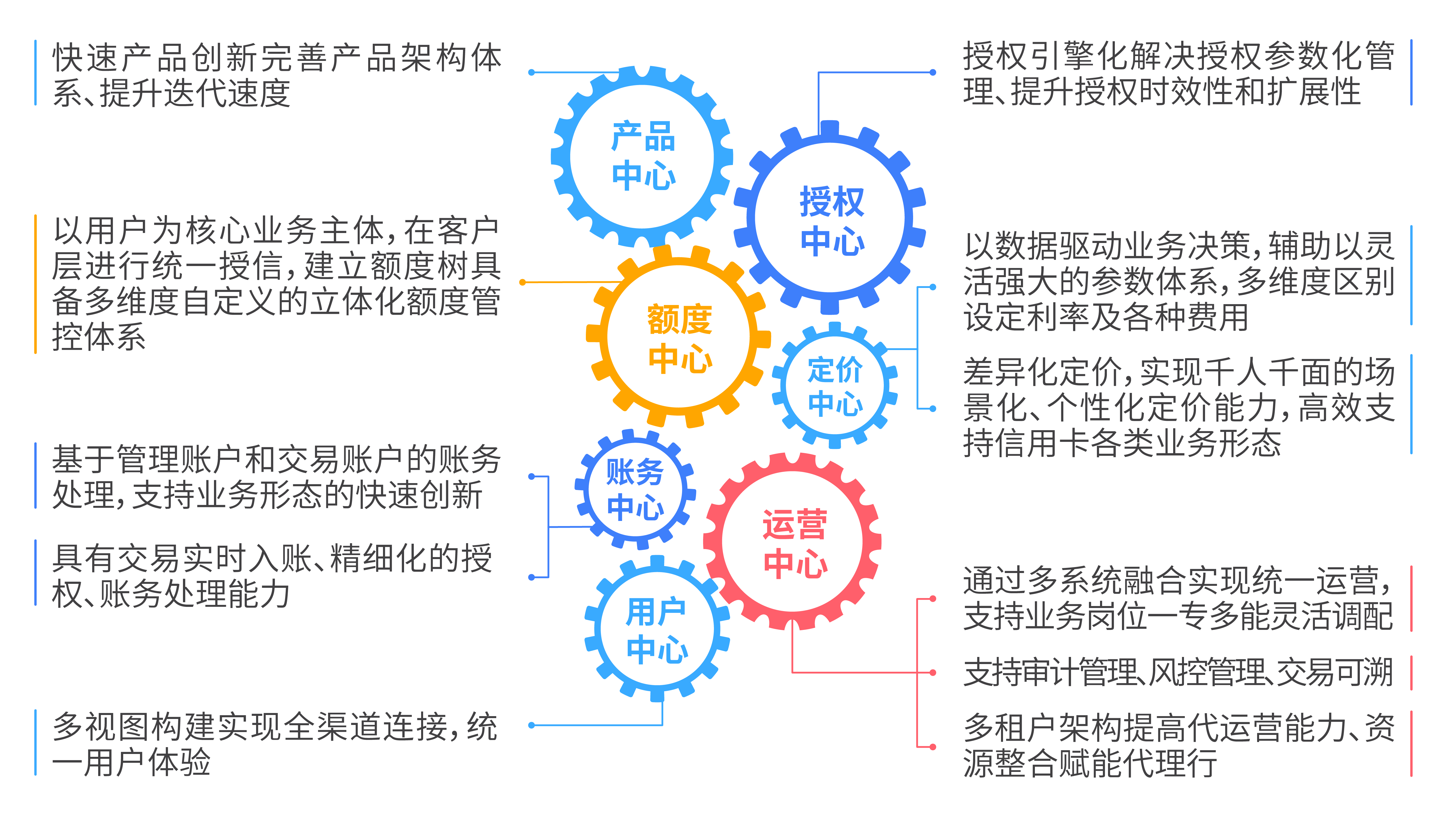 新一代信用卡核心系統(tǒng)基于微服務(wù)化的基本思想,建立各種彼此獨(dú)立又互相協(xié)作的產(chǎn)品中心、定價(jià)中心、額度中心、授權(quán)中心、賬務(wù)中心、運(yùn)營(yíng)中心、用戶(hù)中心等,并以此為依托進(jìn)行產(chǎn)品創(chuàng)新和業(yè)務(wù)的集中運(yùn)營(yíng),從多層面有效支撐銀行信用卡業(yè)務(wù)的飛速發(fā)展。