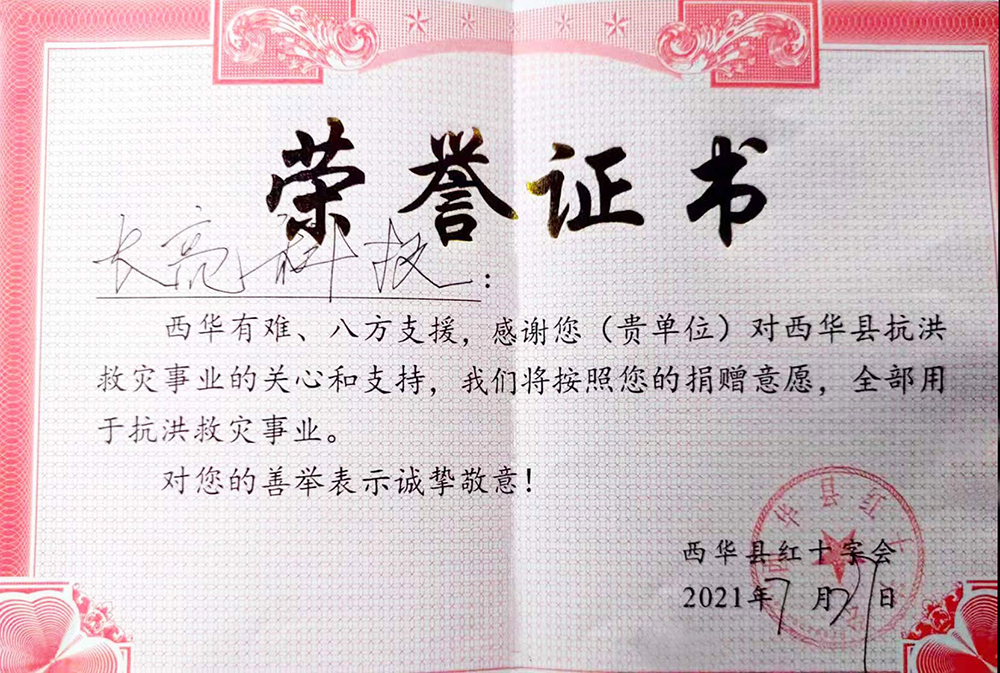 在物資最緊缺的時候,我們募捐的防洪物資已及時送至同胞手中,為他們渡過難關(guān)送去了一份力量和溫暖,贈人玫瑰,手有余香!救災物資到達后,我們也收到了很多來自災區(qū)人民的反饋和感謝,西華縣委辦公室主任反饋“雨鞋和雨衣在一線非常實用,物資非常及時”,西華縣紅十字會也為長亮科技頒發(fā)了榮譽證書,這份感謝屬于我們每一位獻出愛心的長亮人!