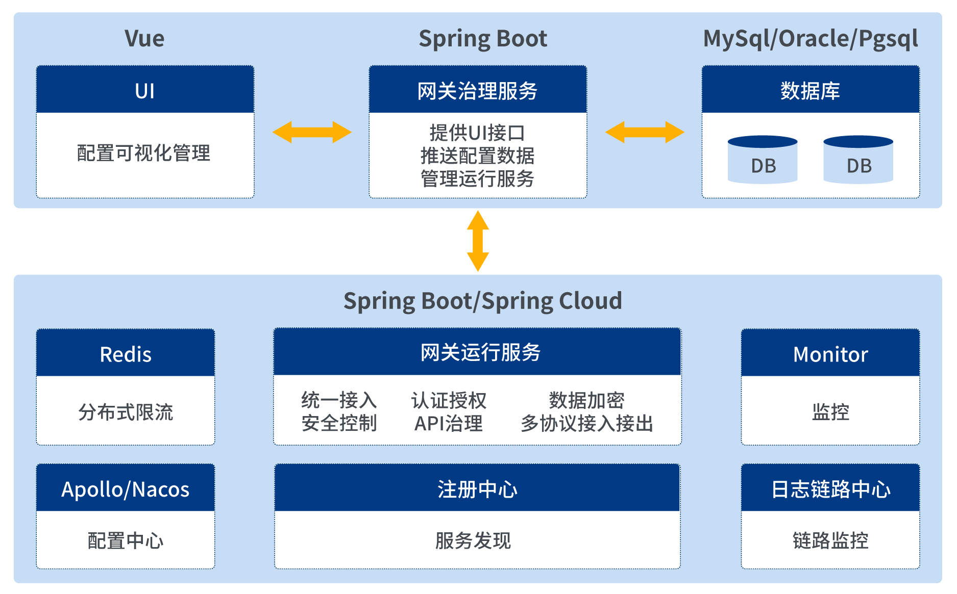 API網(wǎng)關(guān)采用前后端分離架構(gòu)模式,以Java語(yǔ)言開(kāi)發(fā),選用當(dāng)前主流技術(shù)棧Spring Boot,Spring Cloud體系。